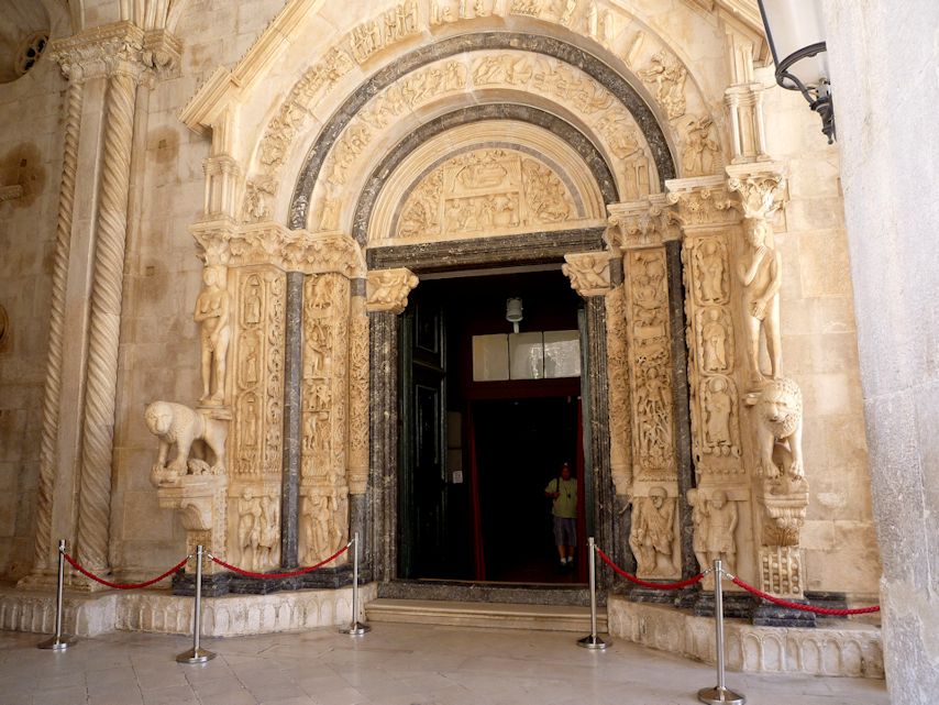 左右にライオンの上にアダムとイヴが立っており、12聖人などが彫られた柱を担いでいるのはユダヤ人。