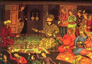 ペルシャ絨毯に座るシャー・アッバス大王 チェヘル・ソトゥン宮殿の壁画(イスファハン) サファビー朝ペルシアの王、シャー・アッバスは、殊のほか絨毯を 愛し、王立の絨毯工房を作って、宮廷画家にデザインさせ、宮廷 用の絨毯を数多く作らせたそうです。 これまで、各地域や部族に受け継がれてきた素朴で直線的な文 様から宮廷の曲線的で華麗な文様へ、また染色や織りの技術に おいても飛躍的発展を遂げました。 当時の絨毯としては、英国のヴィクトリア・アルバート美術館 が所蔵する『アルデビル絨毯』をはじめイタリアのポルティー・ ペッツォーリ博物館の『狩猟文様絨毯』、セルビアモンテネグ ロ(旧ユーゴ)のサラエボ博物館の『花瓶文様絨毯』等々が残 されています。 ![]() ちなみに、絨毯の中央にメダリオンを置き、その上下にペンダントを配して、 四隅にはメダリオンの四分の一の絵柄のコーナー、それらで構成するフィー ルドをボーダーで取り囲むという写本の表紙としても使われているデザイン をシャー・アッバス・メダリオン・コーナー・デザインと言います。
