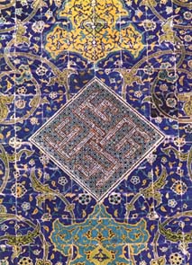 このデザインこそが、今日のペルシャ絨毯の最も典型的なデザインで、サファビー朝ペルシア のアッバス大王の名前が付けられています。 このことからも判る様に、今日のペルシャ絨毯 のデザインの基礎はこの時代(16〜17世紀頃) に形作られたのです。 宮廷の建物の壁画やモザイク、モスクの焼きタ イルの絵柄など、今も古くて新しいこうした文様を駆使してペルシャ絨毯は織 り続けられているのです。 イマーム・モスクの焼きタイル(17世紀)